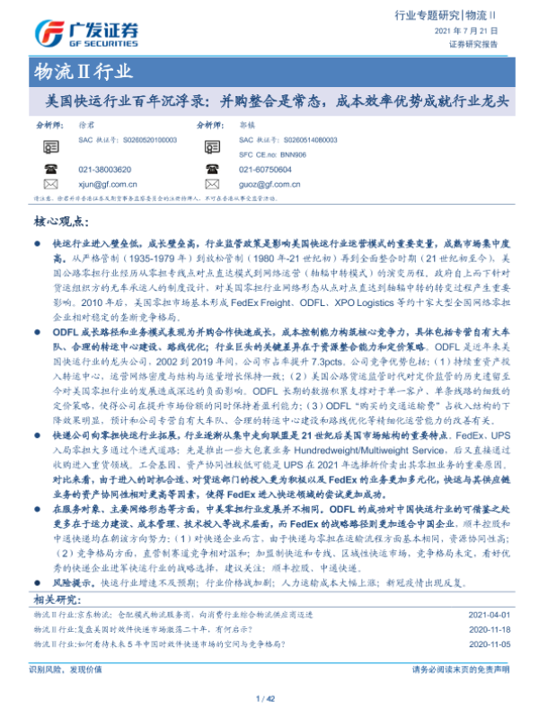 【广发证券】【20210721】物流行业美国快运行业百年沉浮录:并购整合是常态,成本效率优势成就行业龙头-42页 行业研究
