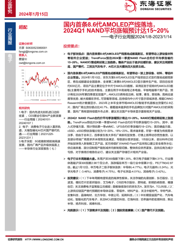 【东海证券】【20240115】国内首条8.6代AMOLED产线落地,2024Q1 NAND平均涨幅预计达15~20%-14页 行业研究