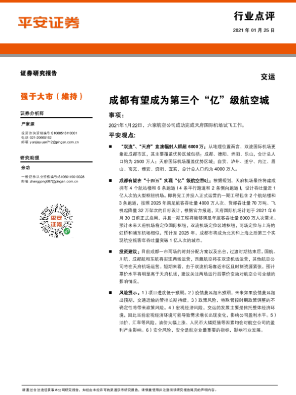 【平安证券】【20210125】交运行业点评:成都有望成为第三个“亿”级航空城-2页 行业研究