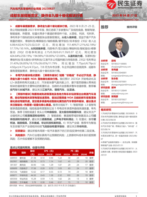 【民生证券】【20230827】汽车和汽车零部件行业周报:成都车展提振需求,静待金九银十催化板块行情-22页 行业研究
