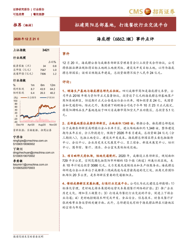 【海通证券】【20201221】餐饮旅游行业报告:事件点评:拟建简阳总部基地,打造餐饮行业交流平台-3页 行业研究