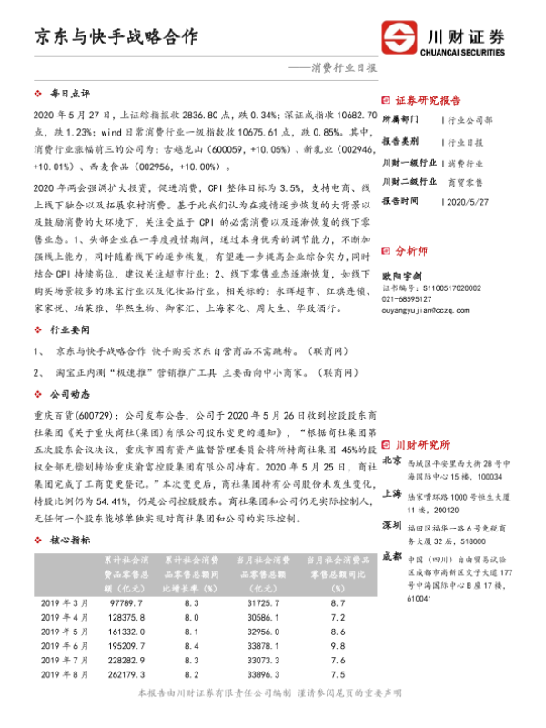 【川财证券】【20200527】消费行业日报:京东与快手战略合作-3页 证券期货研究报告