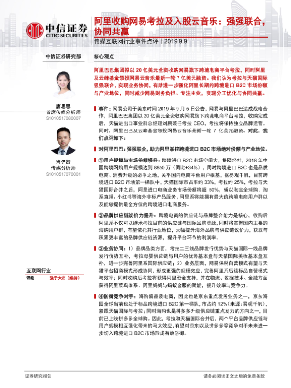 【中信证券】【20190909】20190909-中信证券-传媒互联网行业事件点评:阿里收购网易考拉及入股云音乐:强强联合,协同共赢-5页 行业研究