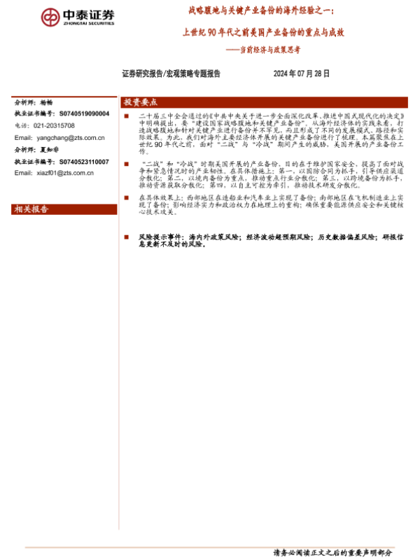 【中泰证券】【20240728】当前经济与政策思考-战略腹地与关键产业备份的海外经验之一:上世纪90年代之前美国产业备份的重点与成效-10页 行业研究