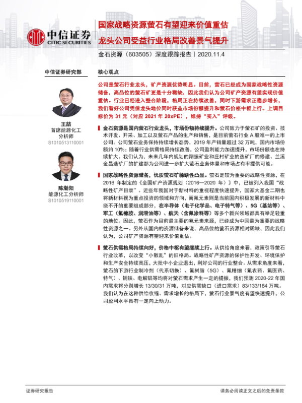 【中信证券】【20201104】20201104-中信证券-金石资源-603505.SH-深度跟踪报告:国家战略资源萤石有望迎来价值重估 龙头公司受益行业格局改善景气提升-35页 行业研究