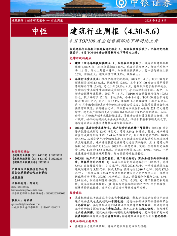 【中银证券】【20230508】建筑行业周报:4月TOP100房企销售额环比下降同比上升-14页 行业研究