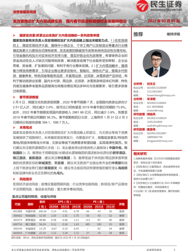 【民生证券】【20220207】消费者服务周报:发改委推动扩大内需战略实施-20页 行业研究
