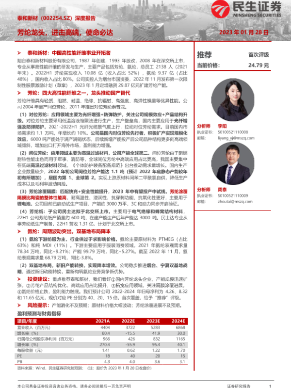 【民生证券】【20230128】泰和新材深度报告(002254):芳纶龙头,进击高端,使命必达-37页 行业研究