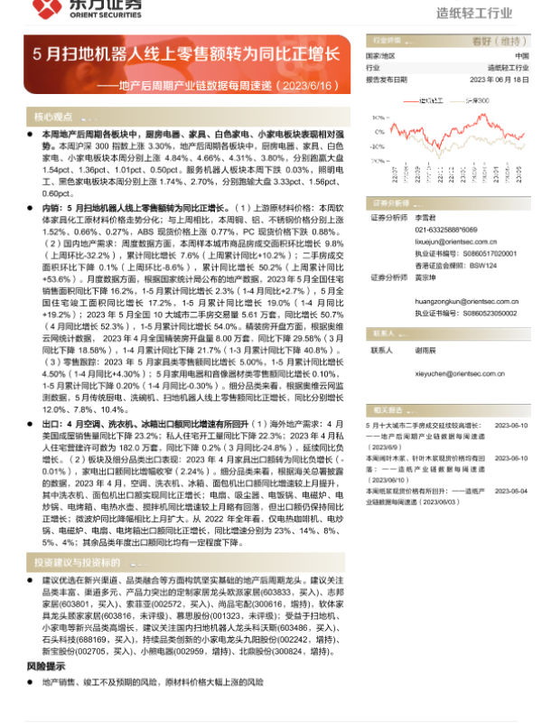 【东方证券】【20230618】20230618-东方证券-造纸轻工行业地产后周期产业链数据每周速递:5月扫地机器人线上零售额转为同比正增长-16页 行业研究