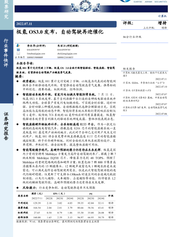 【国泰君安证券】【20220711】极氪 OS3.0发布,自动驾驶再迎催化-2页 行业研究