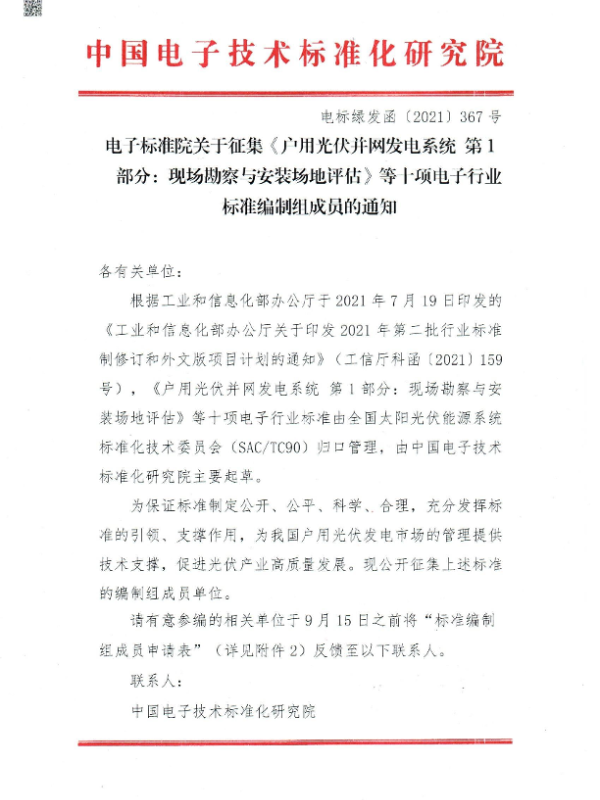 【中国电子技术标准化研究院】【20210813】关于征集《户用光伏并网发电系统 第1部分:现场勘察与安装场地评估》等十项电子行业标准编制组成员的通知-4页 政策文件