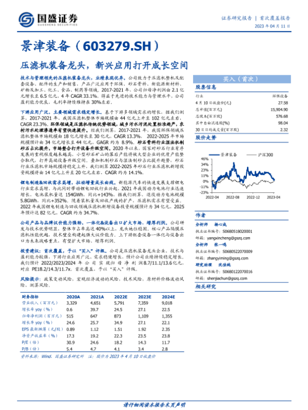 【国盛证券】【20230411】景津装备-603279.SH-压滤机装备龙头,新兴应用打开成长空间-27页 行业研究