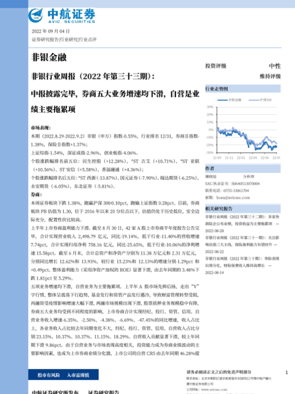 【中航证券】【20220904】非银行业周报:中报披露完毕,券商五大业务增速均下滑,自营是业绩主要拖累项-12页 行业研究