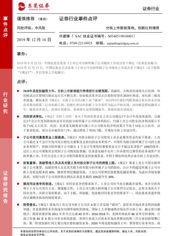 【东莞证券】【20191216】证券行业事件点评:分拆上市新规落地,创新红利增厚-4页 行业研究