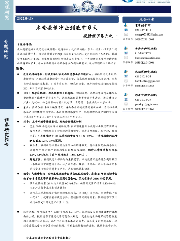 【国泰君安证券】【20220408】本轮疫情冲击到底有多大-18页 行业研究