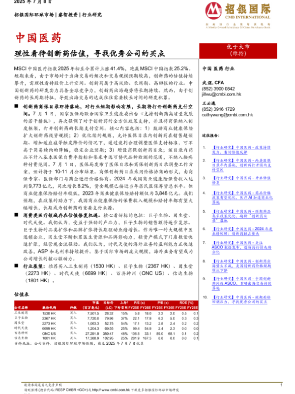 【招银国际】【20250708】理性看待创新药估值,寻找优秀公司的买点-5页 行业研究