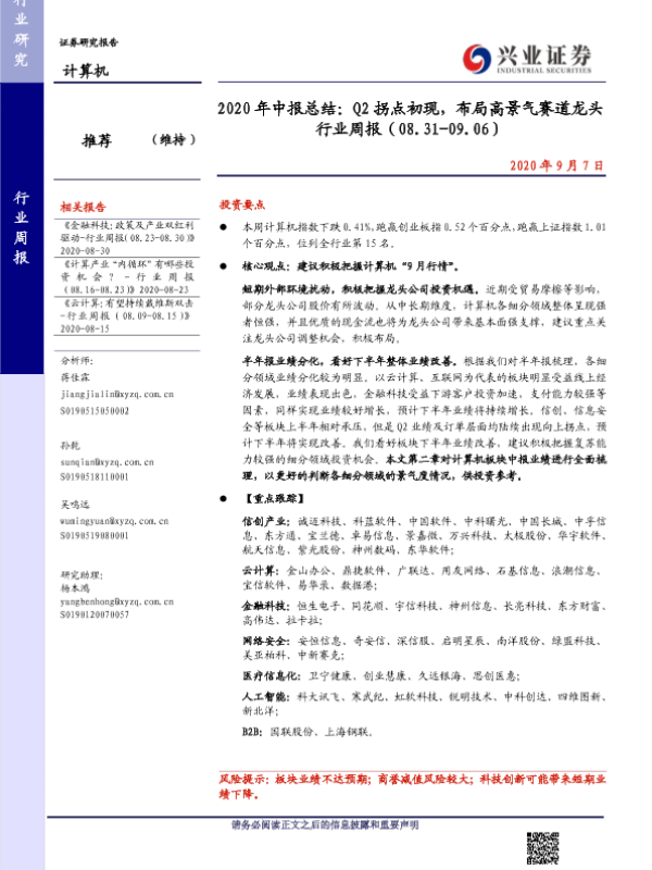 【兴业证券】【20200907】2020年中报总结:Q2拐点初现,布局高景气赛道龙头 行业周报(08.31-09.06)-34页 行业研究