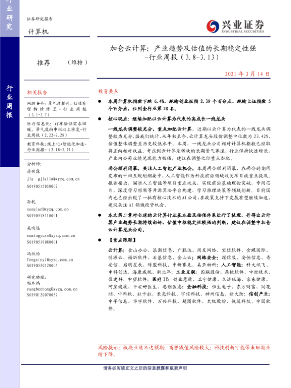 【兴业证券】【20210314】加仓云计算:产业趋势及估值的长期稳定性强 -行业周报(3.8-3.13)-29页 行业研究