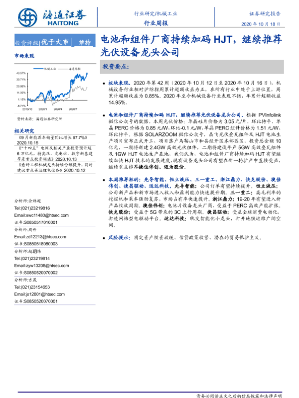 【海通证券】【20201018】20201018-海通证券-机械工业行业周报:电池和组件厂商持续加码HJT,继续推荐光伏设备龙头公司-10页 行业研究
