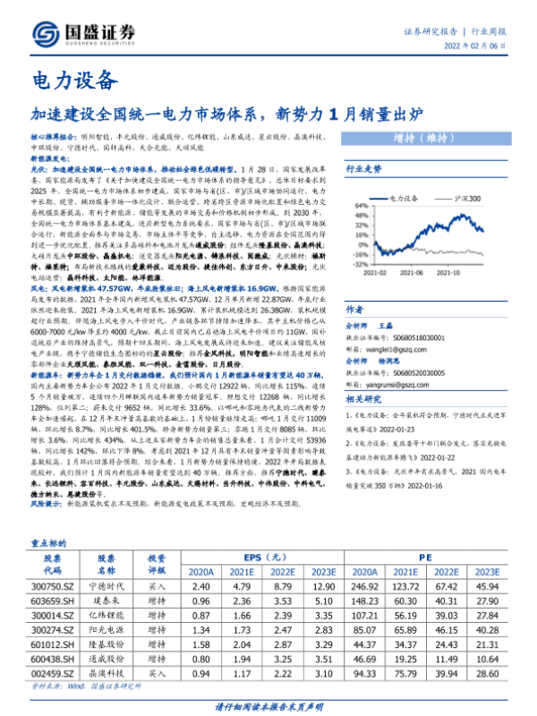 【国盛证券】【20220206】电力设备行业周报:加速建设全国统一电力市场体系,新势力1月销量出炉-14页 行业研究