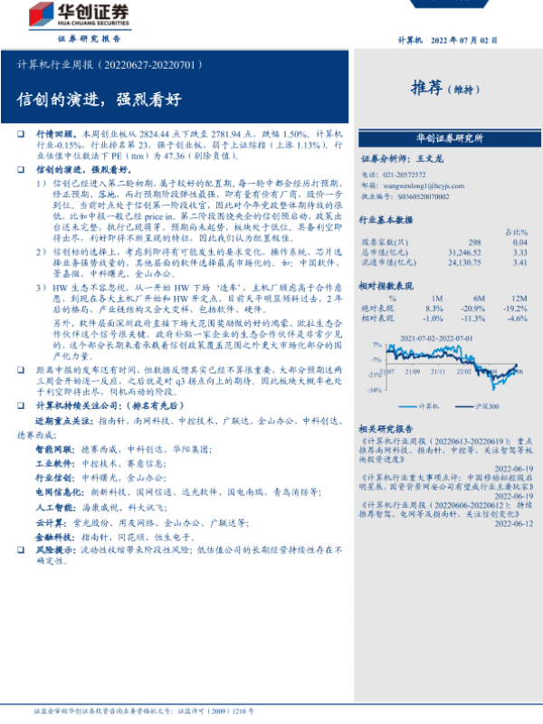 【华创证券】【20220702】计算机行业周报:信创的演进,强烈看好-4页 行业研究
