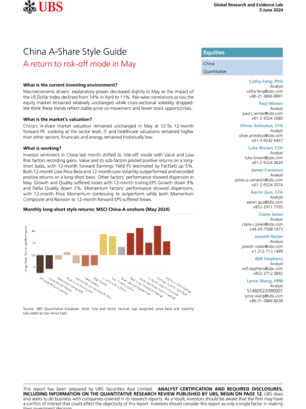 【UBS Securities Asia Limited】【20240603】UBS Equities-China A-Share Style Guide A return to risk-off mode in May-16页 行业研究