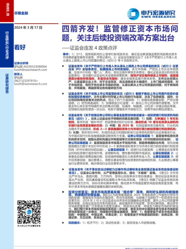 【申万宏源】【20240317】非银金融行业证监会连发4政策点评:四箭齐发!监管修正资本市场问题,关注后续投资端改革方案出台-16页 行业研究