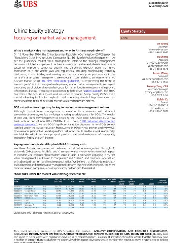 【UBS Securities Asia Limited】【20250122】China Equity Strategy _Focusing on market value management_-20页 行业研究