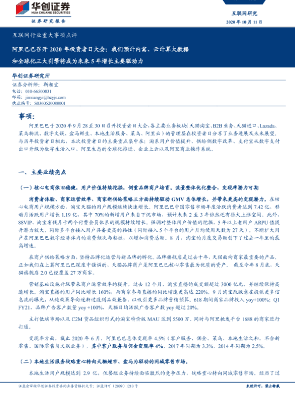 【华创证券】【202010】互联网行业重大事项点评:阿里巴巴召开2020年投资者日大会-7页 行业研究