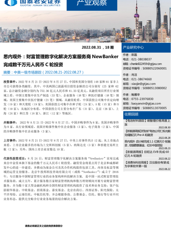 【国泰君安证券】【20220831】产业观察18期:思内观外,财富管理数字化解决方案服务商NewBanker完成数千万元人民币C轮投资-23页 行业研究
