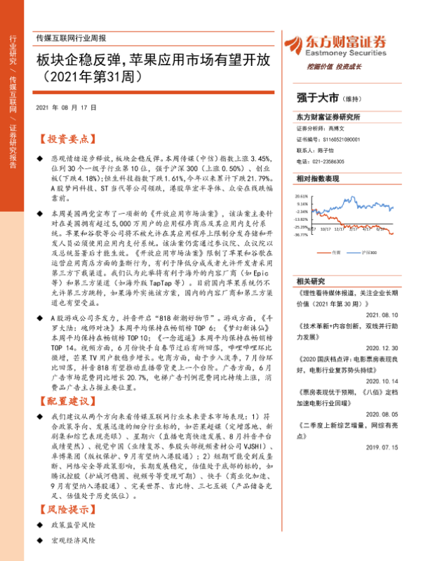 【东方财富证券】【20210817】传媒互联网行业周报:板块企稳反弹,苹果应用市场有望开放-13页 行业研究