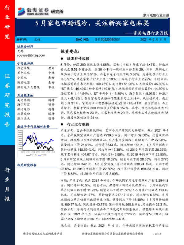 【渤海证券】【20210611】家用电器行业月报:5月家电市场遇冷,关注新兴家电品类-15页 行业研究