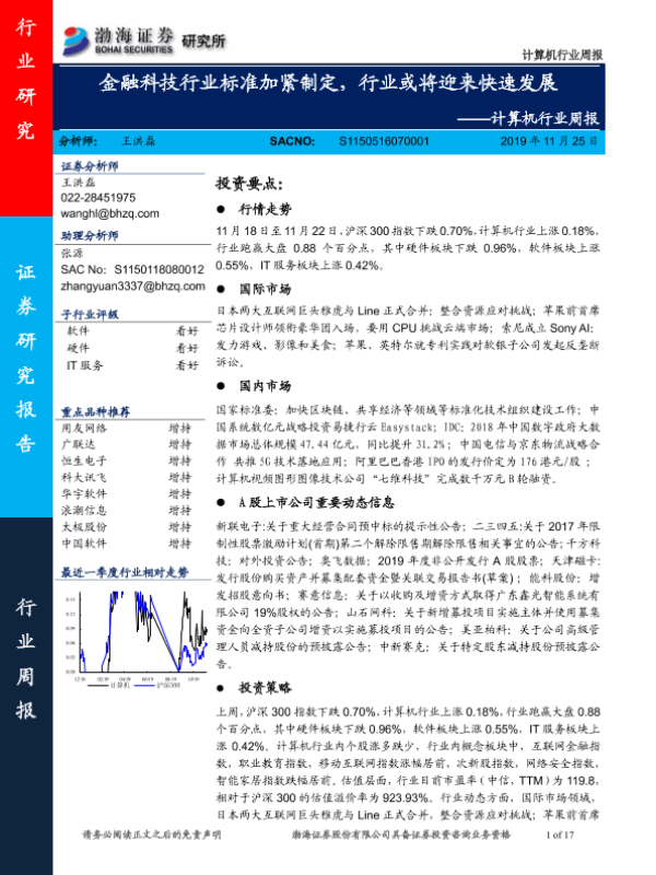 【渤海证券】【20191125】计算机行业周报:金融科技行业标准加紧制定,行业或将迎来快速发展-17页 行业研究