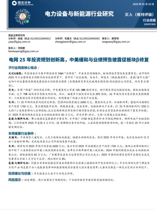【国金证券】【20250119】电力设备与新能源行业研究:电网25年投资规划创新高,中美缓和与业绩预告披露促板块β修复-10页 行业研究