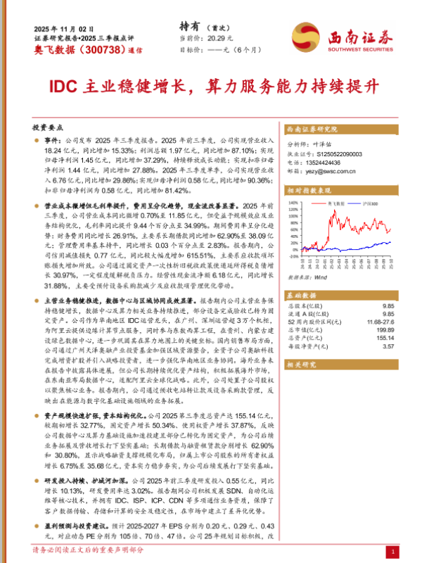 【西南证券】【202511】奥飞数据(300738)2025三季报点评:IDC主业稳健增长,算力服务能力持续提升-17页 证券期货研究报告