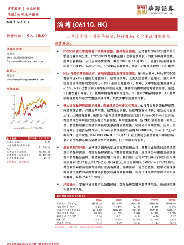【华源证券】【202512】三季度零售下滑高单位数_静待Nike大中华区调整效果-3页 证券期货研究报告