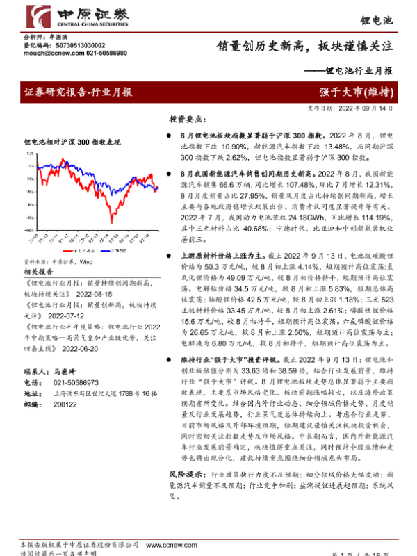 【中原证券】【20220914】锂电池行业月报:销量创历史新高,板块谨慎关注-18页 行业研究