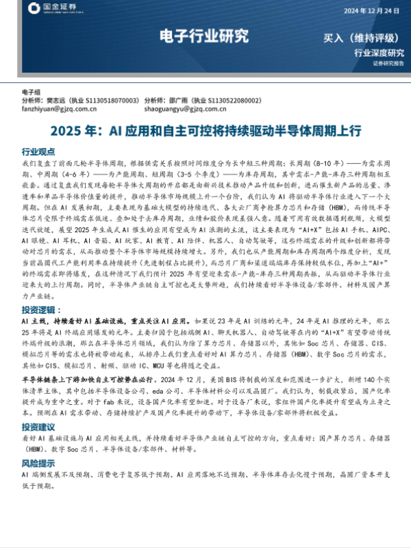 【国金证券】【20241229】2024年12月29日更新-电子行业深度研究:2025年AI应用和自主可控将持续驱动半导体周期上行-28页 行业研究