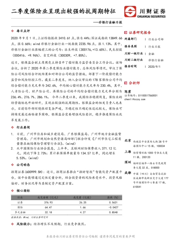 【川财证券】【20200901】二季度保险业呈现出较强的抗周期特征-2页 行业研究