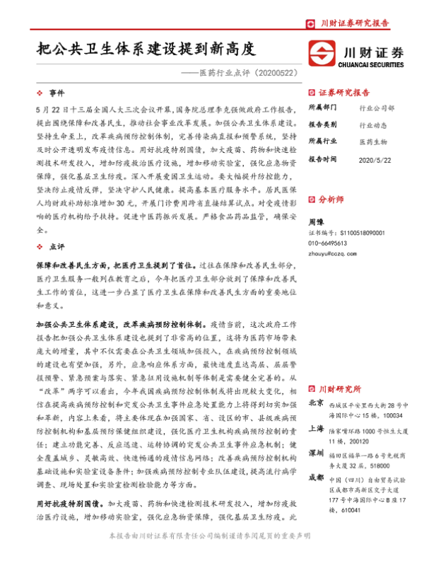 【川财证券】【20200522】医药行业点评:把公共卫生体系建设提到新高度-3页 证券期货研究报告