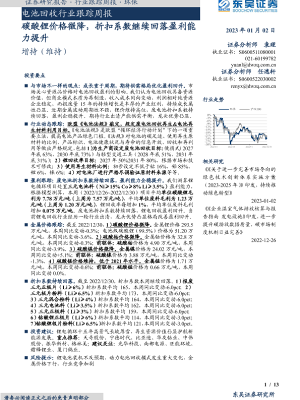 【东吴证券】【20230102】电池回收行业跟踪周报:碳酸锂价格微降,折扣系数继续回落盈利能力提升-13页 行业研究