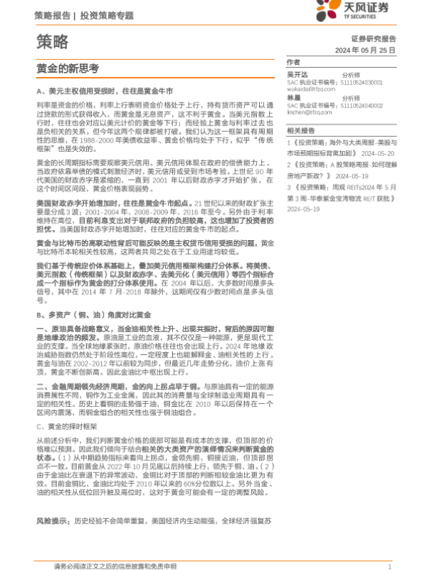 【天风证券】【20240525】投资策略专题:黄金的新思考-20页 行业研究