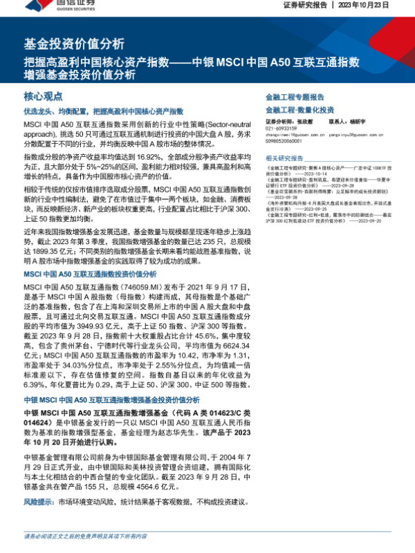 【国信证券】【20231023】基金投资价值分析:中银MSCI中国A50互联互通指数增强基金投资价值分析,把握高盈利中国核心资产指数-17页 行业研究