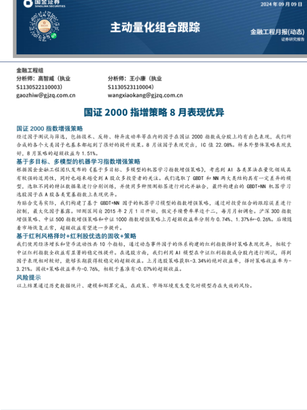 【国金证券】【20240909】主动量化组合跟踪:国证2000指增策略8月表现优异-11页 行业研究
