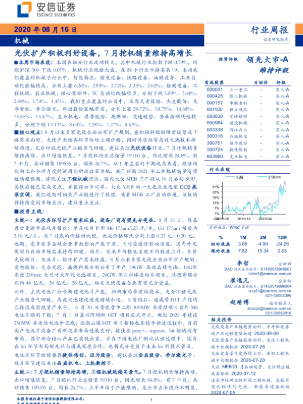 【安信证券】【20200816】机械行业周报:光伏扩产积极利好设备,7月挖机销量维持高增长-23页 行业研究