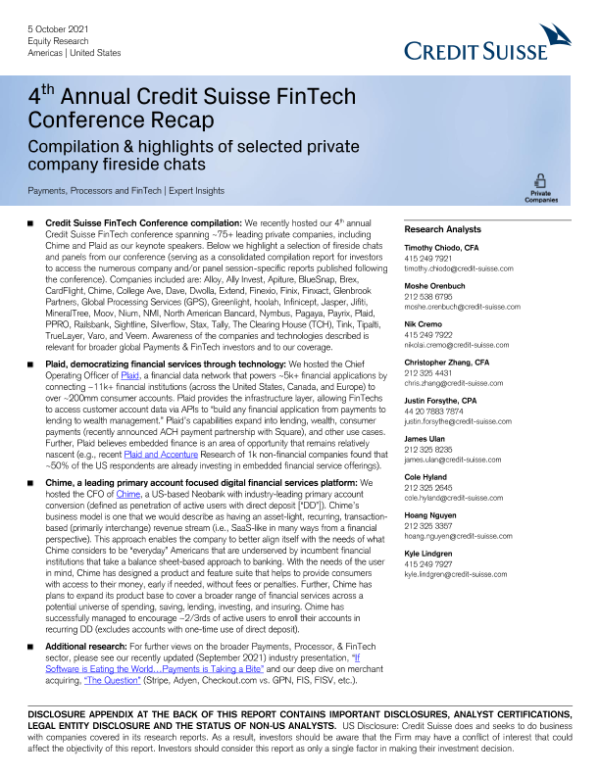【Credit Suisse】【20211005】瑞信-美股金融科技行业-精选私营公司炉边谈话的汇编和要点-21页 行业研究
