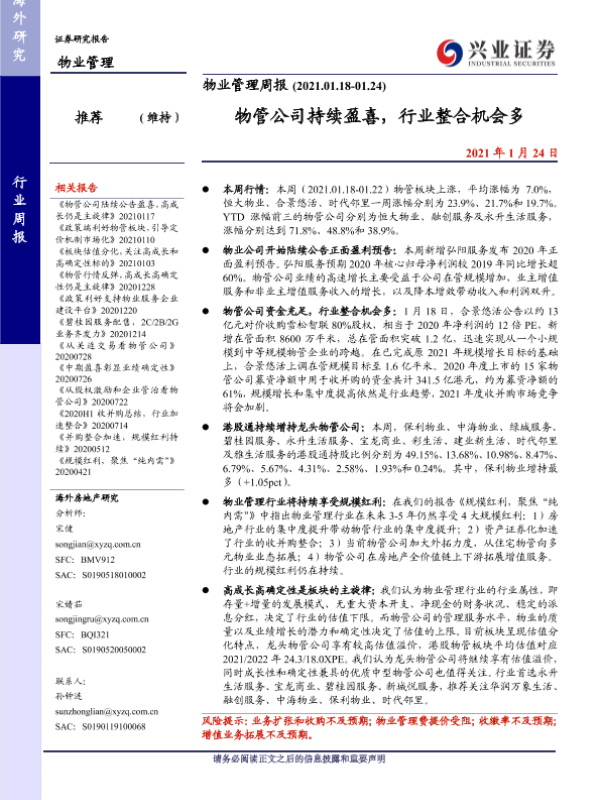 【兴业证券】【20210124】物管公司持续盈喜,行业整合机会多-7页 行业研究