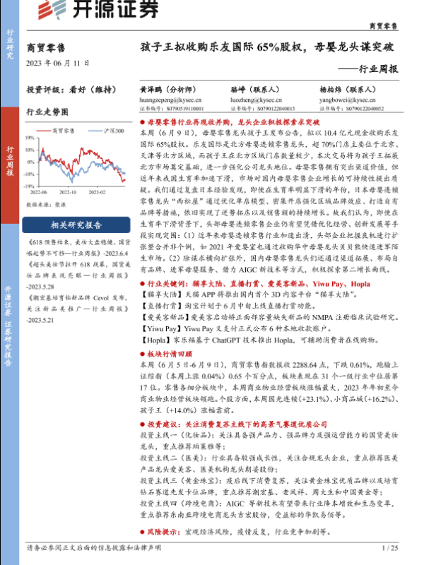 【开源证券】【20230611】商贸零售行业周报:孩子王拟收购乐友国际65%股权,母婴龙头谋突破-25页 行业研究