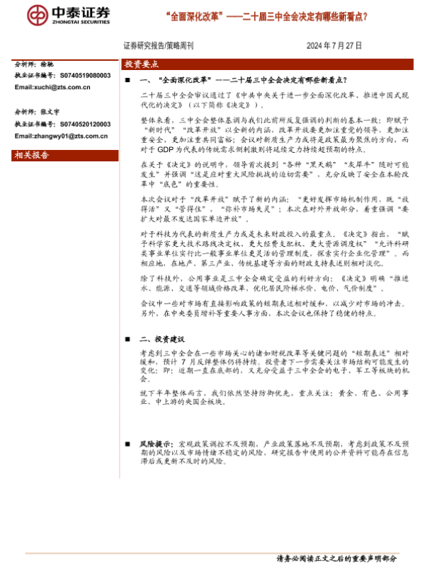 【中泰证券】【20240727】二十届三中全会决定有哪些新看点?全面深化改革-10页 行业研究