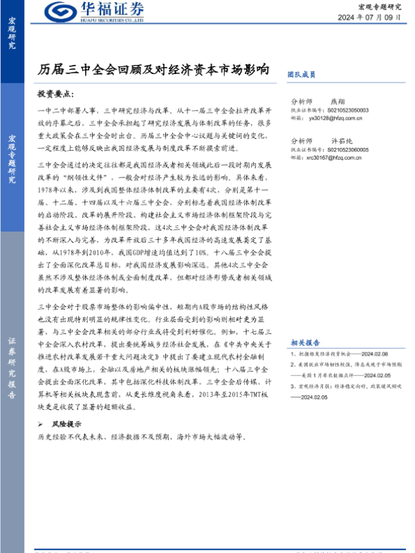 【华福证券】【20240709】宏观专题研究:历届三中全会回顾及对经济资本市场影响-10页 行业研究